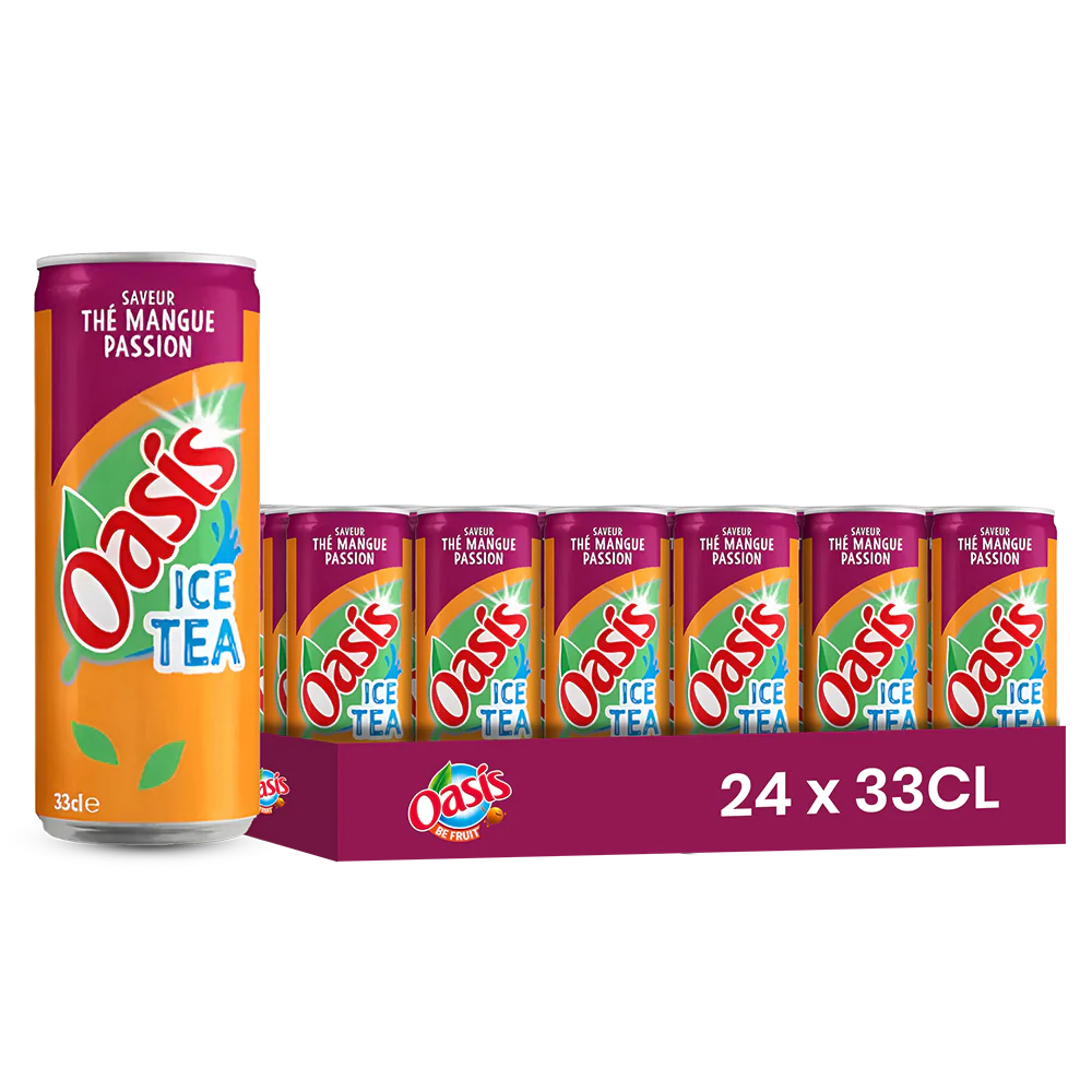 Oasis Thé Mangue Passion est une boisson à base de thé aux arômes de mangue et de fruit de la passion, légère, fruitée et légèrement sucrée. Une alternative aux sodas classiques, dans la tendance des boissons au thé fruité, avec la notoriété de la marque Oasis.