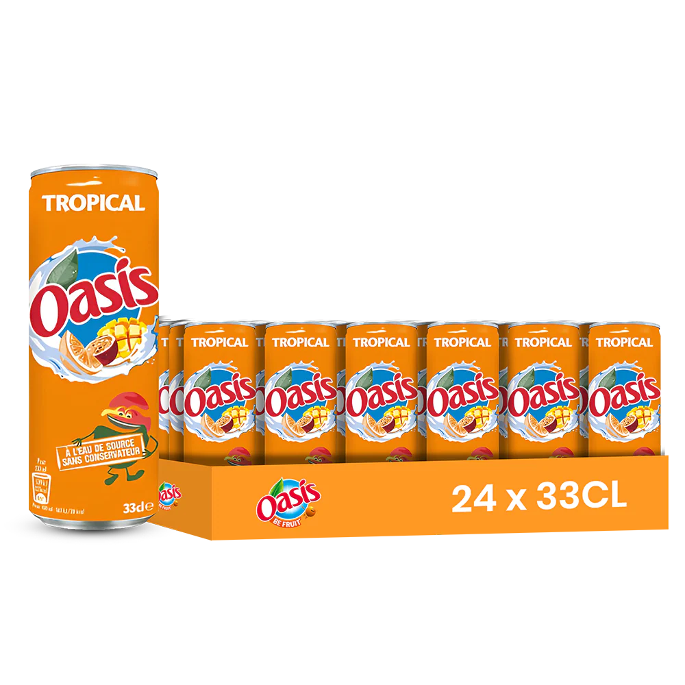 Oasis Tropical est une boisson gazeuse aux jus et arômes de fruits tropicaux, légèrement sucrée et très rafraîchissante. Marque historique du groupe Tropicana, Oasis bénéficie d’une forte notoriété en France, notamment auprès d’une clientèle familiale et jeune.