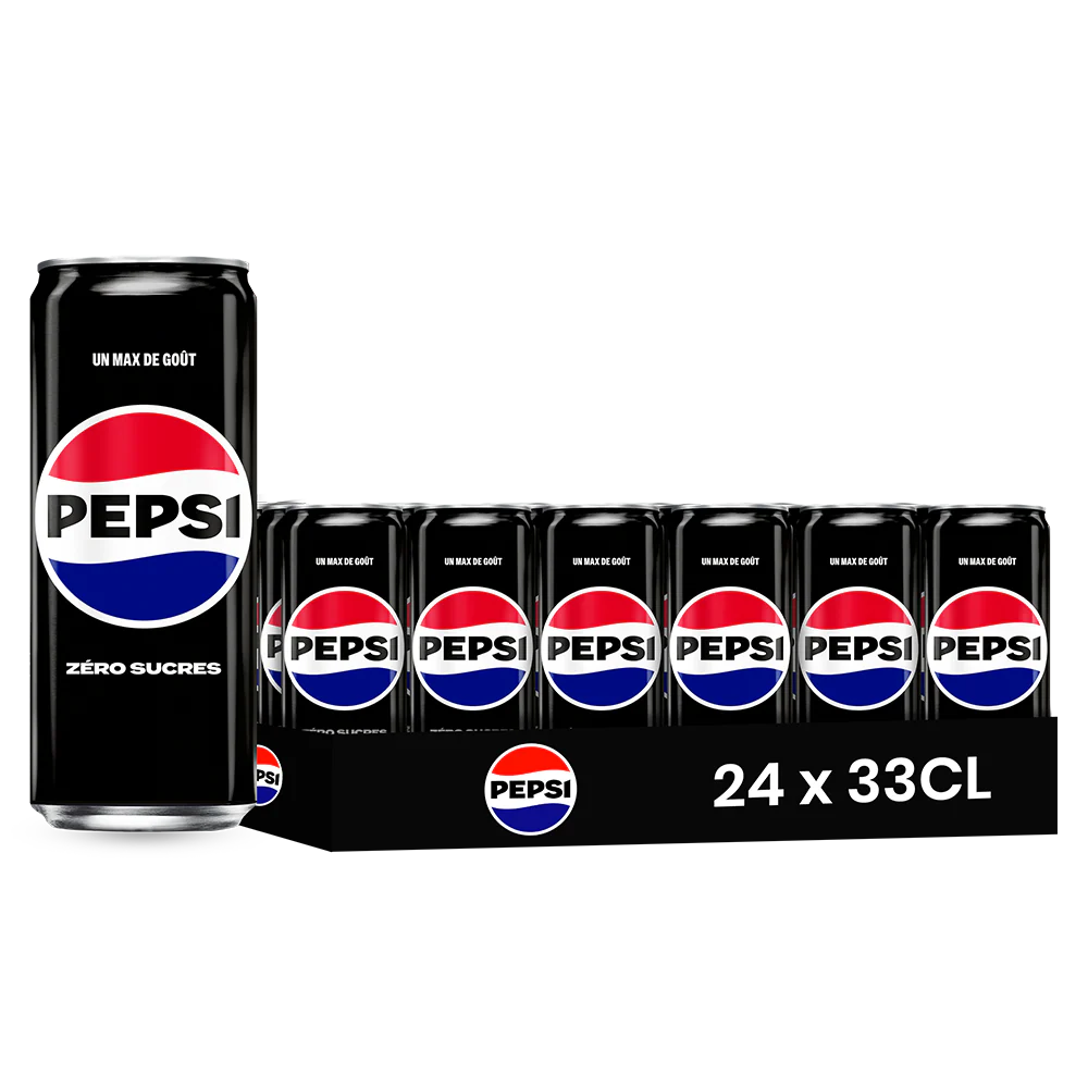 En canette aluminium de 33 cl, ce format s’intègre naturellement dans tout rayon boissons gazeuses aux côtés du Pepsi Classic. Le pack de 24 canettes est le format standard pour les épiceries, supérettes, bars et distributeurs automatiques.