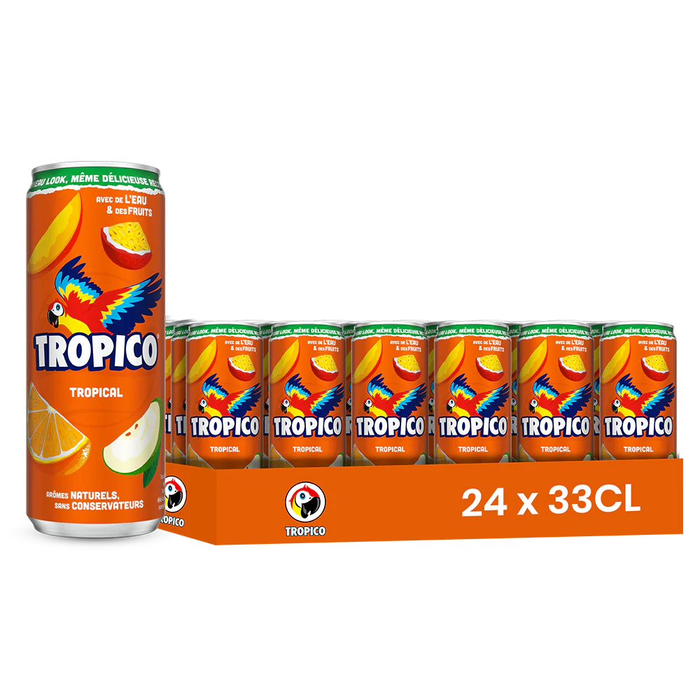 Pack de 24 canettes Tropico 33 cl, boisson gazeuse aux arômes et jus de fruits tropicaux, sucrée et colorée, très prisée dans les épiceries ethniques, africaines et antillaises. Une référence incontournable pour offrir à vos clients une expérience exotique et rafraîchissante, disponible à prix grossiste avec livraison rapide par DESTOCK BREIZH DISTRIBUTION.